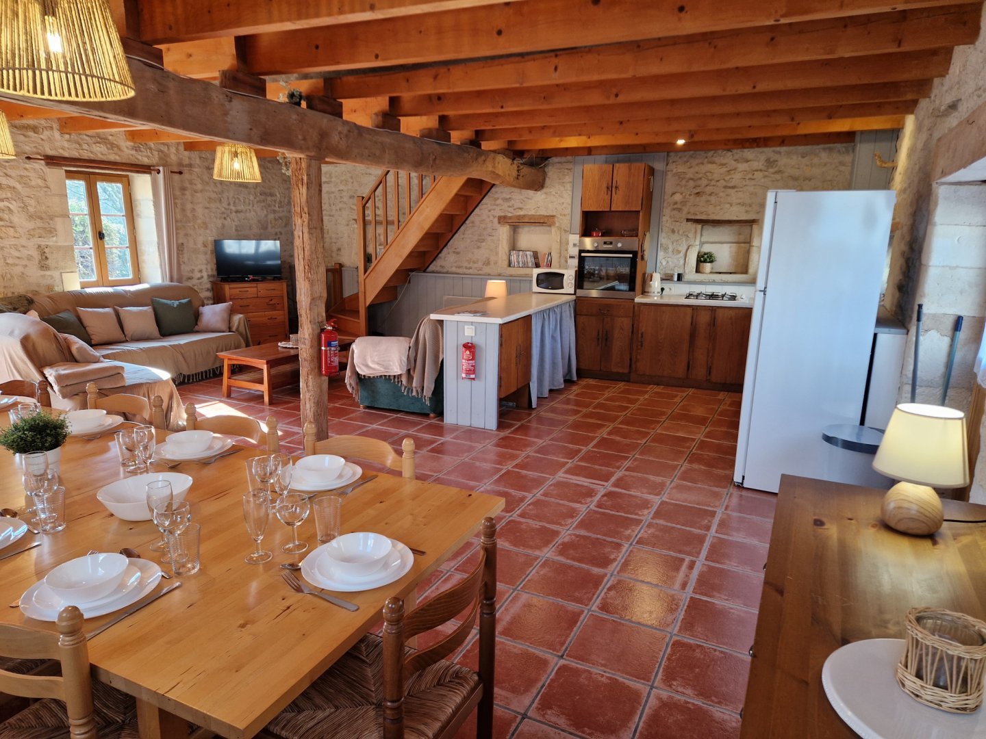 Une pièce de vie avec cuisine équipée, salle à manger, coin salon